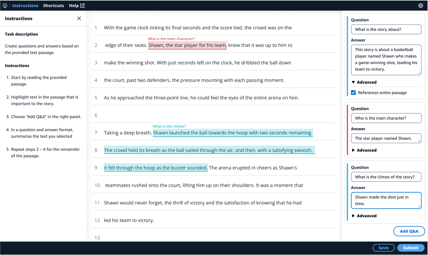 The following screenshot shows a labeling UI in which a human annotator will read a text passage and generate both questions and answers in the process of building a Q&A demonstration dataset.