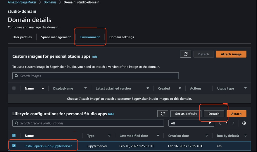 - Select the lifecycle configuration for the Spark UI on SageMaker Studio.