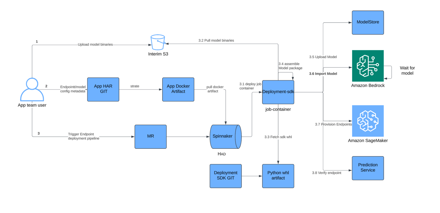 Salesforce’s transition from Amazon SageMaker Inference to Amazon Bedrock Custom Model Import required careful integration with their existing MLOps pipeline to avoid disrupting production workloads. The team’s primary goal was to maintain their current API endpoints and model serving interfaces, keeping zero downtime and no required changes to downstream applications. With this approach, they could use the serverless capabilities of Amazon Bedrock while preserving the investment in their existing infrastructure and tooling. The integration strategy focused on creating a seamless bridge between their current deployment workflows and Amazon Bedrock managed services, enabling gradual migration without additional operational risk.