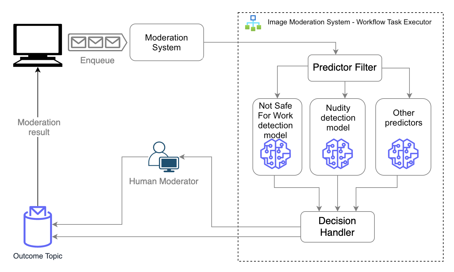 - System complexity – The architecture complexity requires investments in MLOps to ensure the ML inference process scales efficiently to meet the growing content submission traffic.