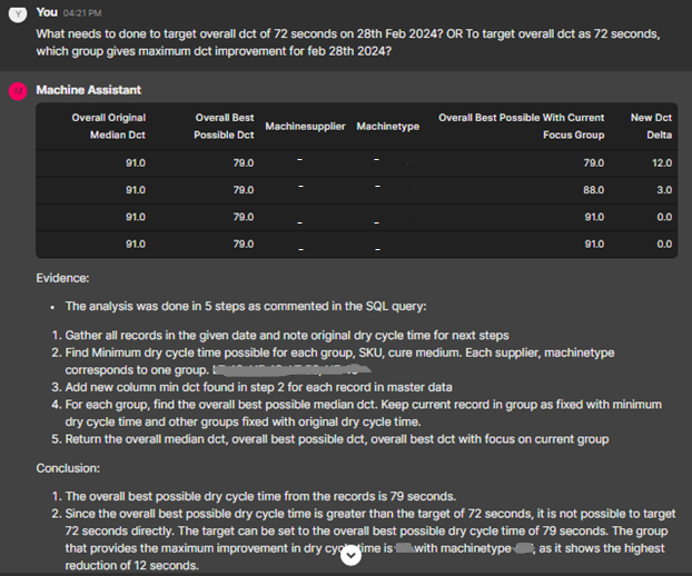 With the agentic AI Manufacturing Reasoner, the goal was to empower their plant engineers to perform corrective actions on accelerated RCA insights to reduce curing DCT. This agentic AI solution and virtual experts (agents) help plant engineers interact with industrial IoT connected to big data in natural language (English) to retrieve relevant insights and provide insightful recommendations for resolving operational issues in DCT processes. The RCA agent offers detailed insights and self-diagnosis or recommendations, identifying which of the over 25 automated subelements or activities should be focused on across more than 250 automated curing presses, more than 140 stock-keeping units (SKUs), three types of curing mediums, and two types of machine suppliers. The goal is to achieve the best possible reduction in DCT across three plants. Through this innovation, plant engineers now have a thorough understanding of their manufacturing bottlenecks. This comprehensive view supports data-driven decision-making and enhances operational efficiency. They realized an approximate 88% reduction in effort in assisting RCA for DCT through self-diagnosis of bottleneck areas on streaming and real-time data. The generative AI assistant reduces the DCT RCA from up to 7 hours per issue to less than 10 minutes per issue. Overall, the targeted benefit is expected to save approximately 15 million Indian rupees (INR) per year just in the passenger car radial (PCR) division across their three manufacturing plants.