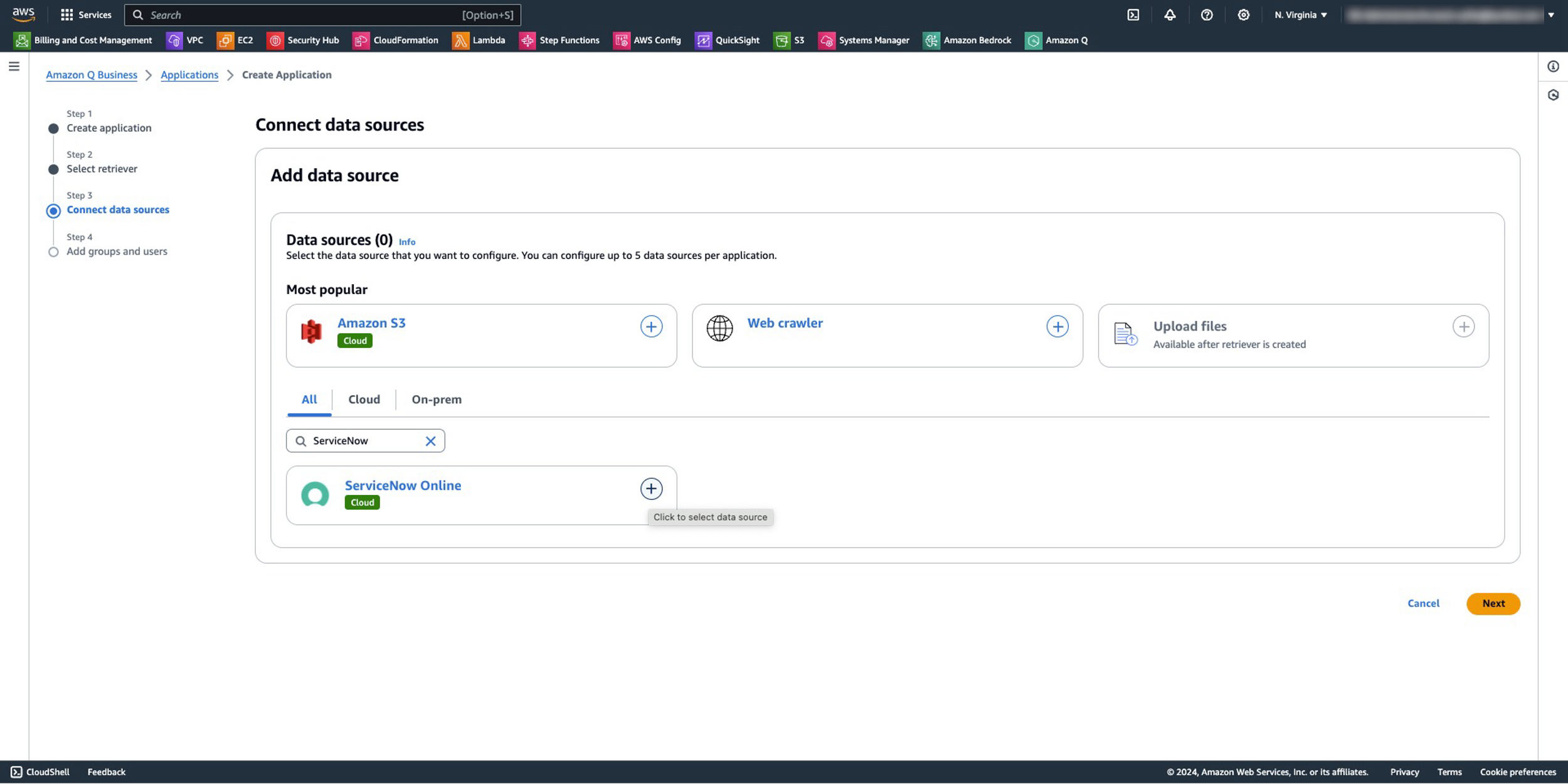- Create an Amazon Q Business application and configure the ServiceNow data source and retriever in Amazon Q Business