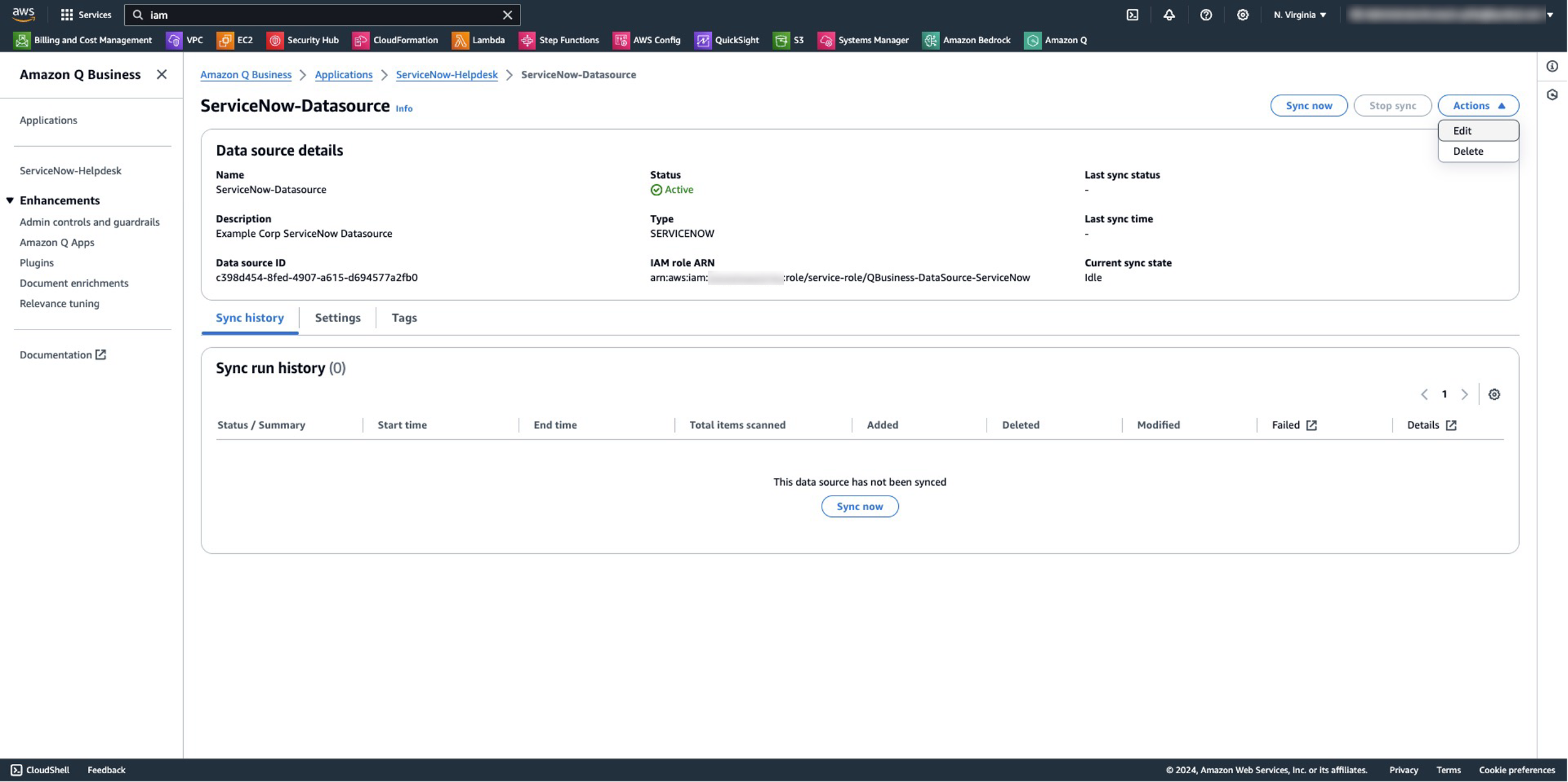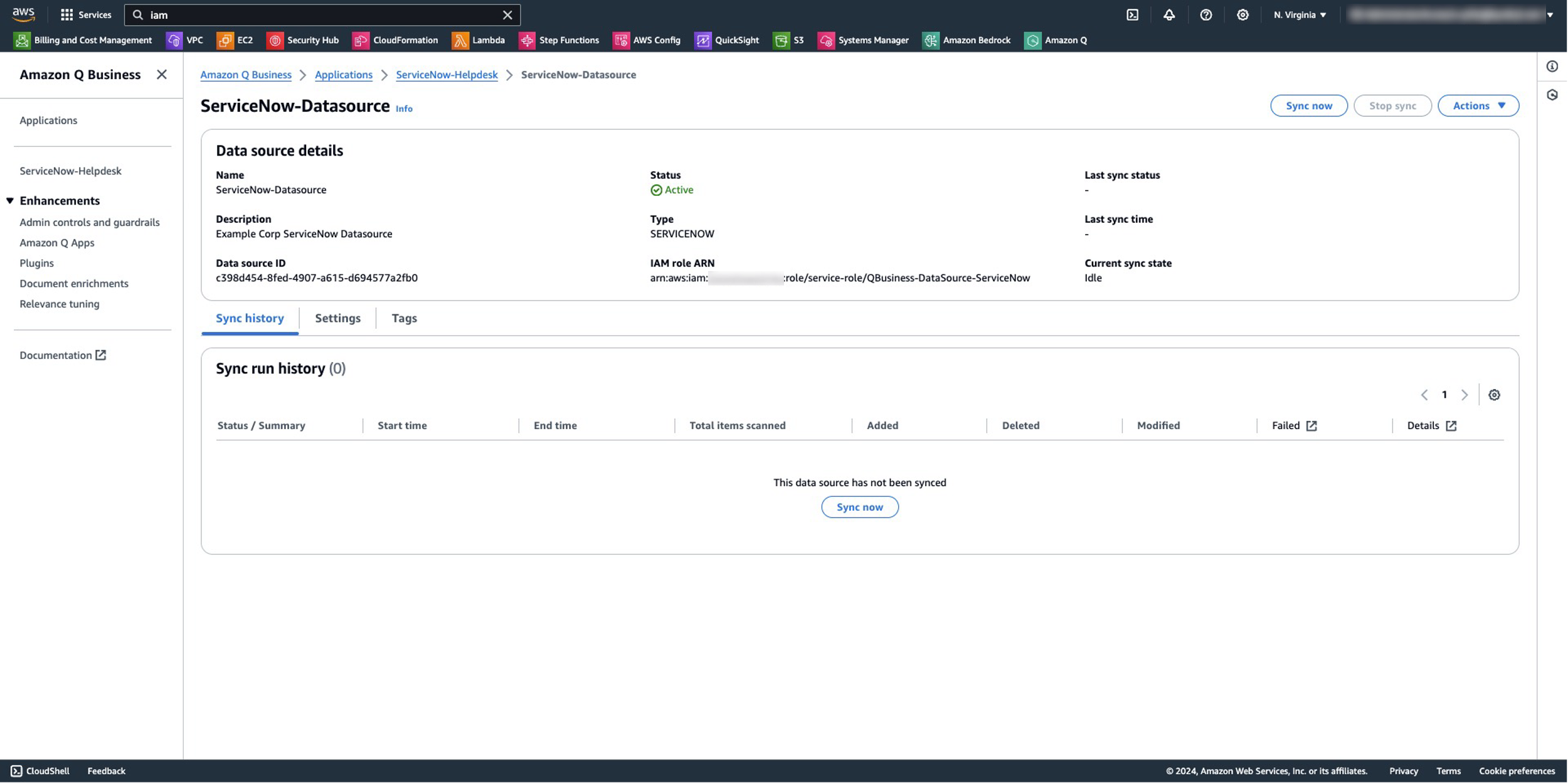 This completes the data source configuration for Amazon Q Business. The configuration takes a few minutes to be completed. Watch the screen for any errors and updates. Once the data source is created, you will be greeted with a message You successfully created the following data source: ‘ServiceNow-Datasource’