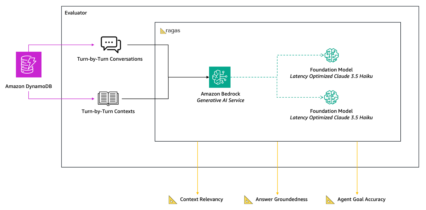 - AWS Lambda – Automated evaluation functions measuring context relevance, response groundedness, and goal accuracy