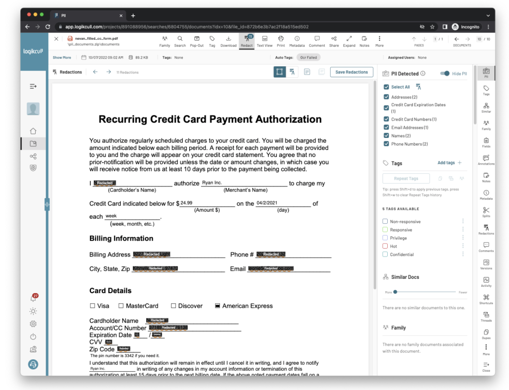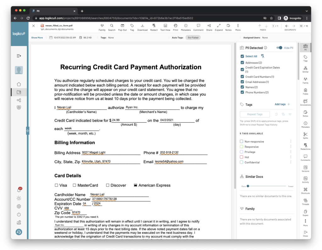 DetectPiiEntitiesAPI action inspects the input text for entities that contain PII. For each entity, the response provides the entity type, where the entity text begins and ends, and the level of confidence that Amazon Comprehend has in its detection. - The users then select the specific entities that they want to redact using Logikcull’s web interface. The applications server sends these requests to Logikcull’s processing pipeline. The following is a screenshot of a PDF that was uploaded to Logikcull’s application. From the below screenshot, you can see that different PII entities such as name, address, phone number, email address, and so on, have been highlighted.