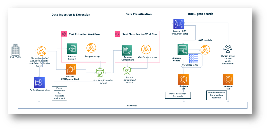 The AIDA technical solution was developed by AWS Professional Services and the UNICC. The core technology platform was designed and developed by the AWS ProServe team. The UNICC was responsible for developing the AIDA web portal and human-in-the-loop interface. The AIDA platform was envisioned to provide a simple and highly accurate mechanism to search UNDP evaluation reports across various themes and export them for further analysis. AIDA’s architecture needed to address several requirements: