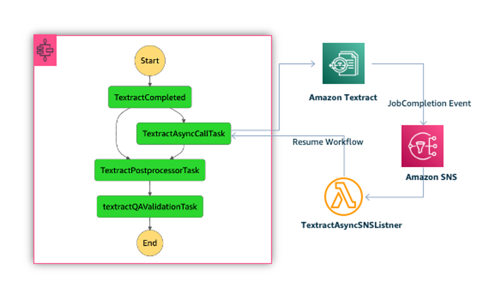 TextractCompletedis the first step to ensure documents are not processed multiple times with Amazon Textract. This step is to avoid unnecessary processing time and cost by preventing duplicate processing.TextractAsyncCallTasksubmits the documents to be processed by Amazon Textract using the asynchronous StartDocumentTextDetection API. This API processes the documents and stores the JSON output files in Amazon S3 for postprocessing.TextractAsyncSNSListeneris an AWS Lambda function that handles the Amazon Textract job completion event, and returns the metadata back to the workflow for further processing.TextractPostProcessorTaskis an AWS Lambda function that uses the metadata and processes the JSON output files produced by Amazon Textract to extract meaningful paragraphs.TextractQAValidationTaskis an AWS Lambda function that performs some simple text validations on the extracted paragraphs and collects metrics like number of complete or incomplete paragraphs. These metrics are used to measure the quality of text extractions.