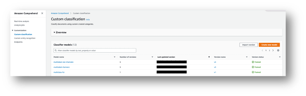 The data classification component identifies the critical parts of the evaluation reports, and further classifies them into a taxonomy of categories organized around the various themes of the Sustainable Development Goals. We have built one multi-class and two multi-label classification models with Amazon Comprehend.