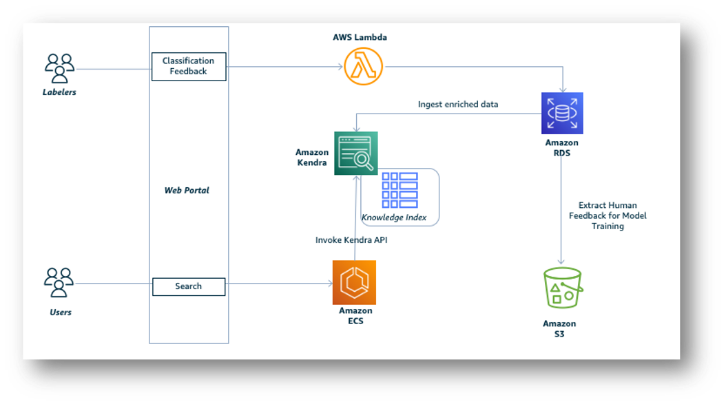 Amazon Kendra is used for intelligent searches. Enriched content from Amazon RDS for PostgreSQL is ingested into Amazon Kendra for indexing. The web portal layer uses the intelligent search capability of Amazon Kendra to intuitively search the indexed content. Labelers use the human-in-the-loop user interface to update the text classification generated by Amazon Comprehend for any extracted paragraphs. Changes to the classification are immediately reflected in the web portal, and human-updated feedback is extracted and used for Amazon Comprehend model training to continuously improve the custom classification model.