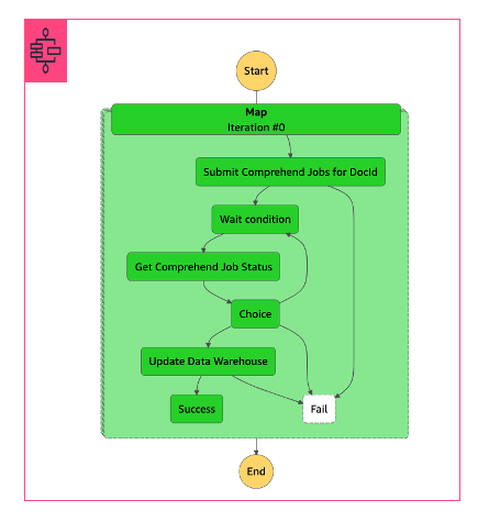 To reduce cost on the classification process, we have created the workflow to submit Amazon Comprehend jobs in batch mode. The workflow waits for all the Amazon Comprehend jobs to complete and performs data refinement by aggregating the text extraction and Amazon Comprehend results to filter the paragraphs that aren’t identified as FRC, and aggregates the thematic and non-thematic classification categories by paragraphs.