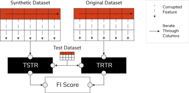 Highly related to the prediction score, the feature importance (FI) score extends it by adding interpretability to the TSTR and TRTR scores.