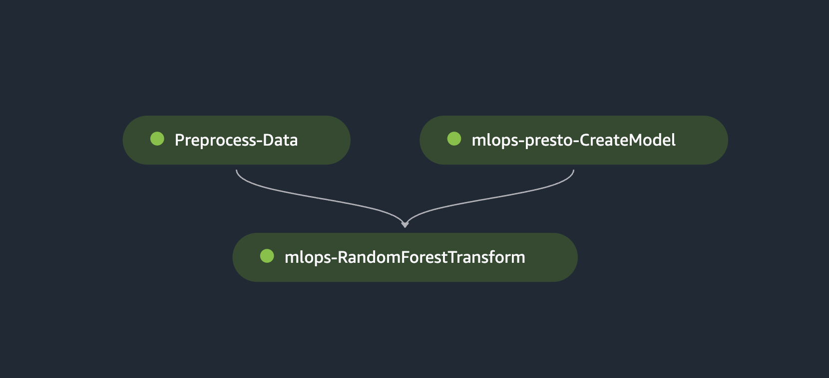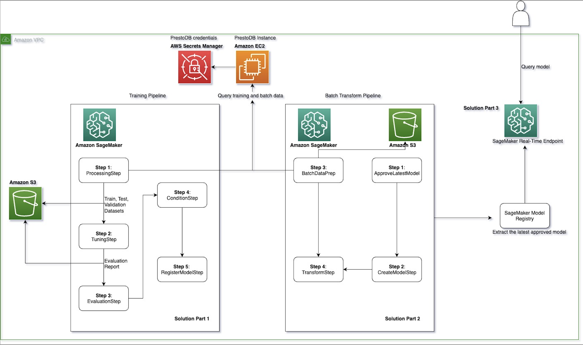 The end goal was to convert the existing steps into two pipelines: a training pipeline and a batch transform pipeline that connected the data queried from PrestoDB to a SageMaker Processing job, and finally deploy the trained model to a SageMaker endpoint for real-time inference.