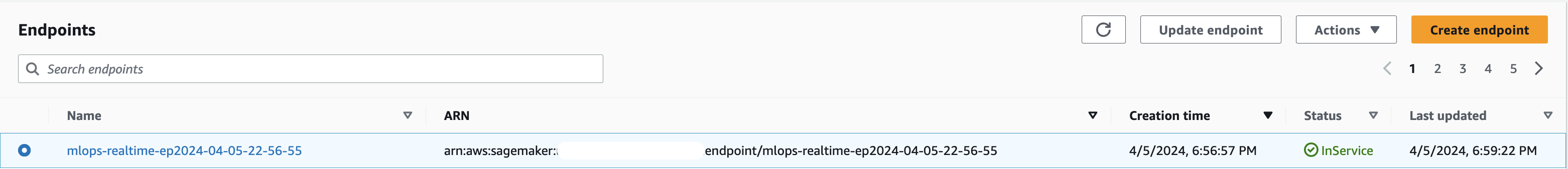 - Run inference on the deployed real-time endpoint – After you have extracted the latest approved model, created the model from the desired image URI, and configured the endpoint configuration, you can deploy it as a real-time SageMaker endpoint: