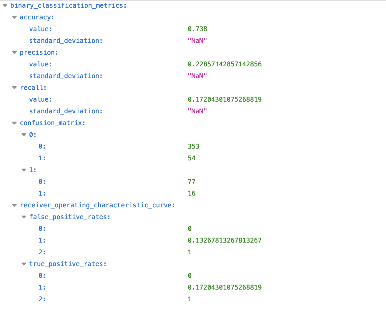 The evaluation step uses the evaluation script as a code entry. This script prepares the features and target values, and calculates the prediction probabilities using model.predict. At the end of the run, an evaluation report is sent to Amazon S3 that contains information on precision, recall, and accuracy metrics.