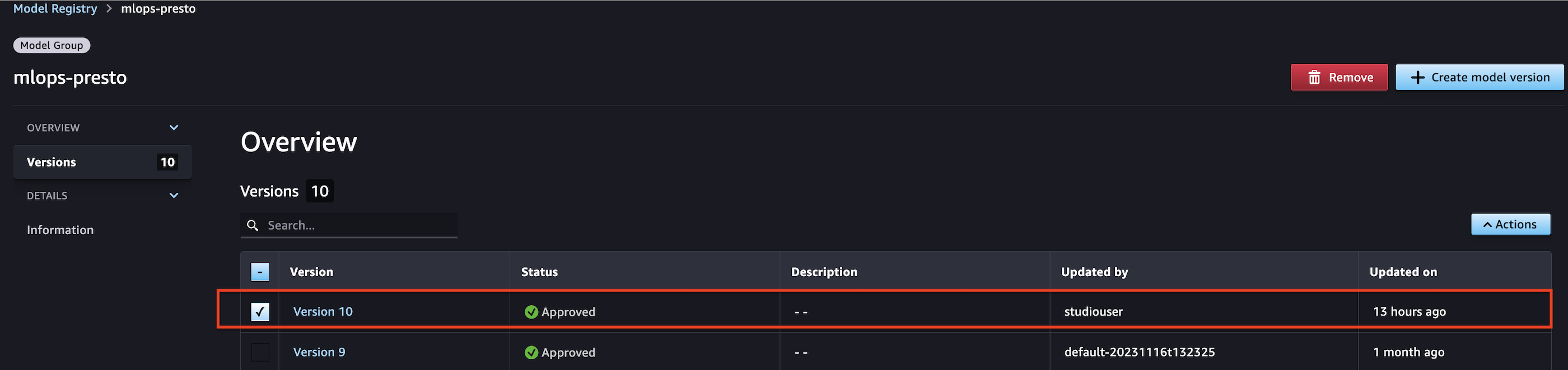 - Batch transform pipeline – In this step, we run a preprocessing data step that reads data from a PrestoDB instance and runs batch inference on the registered ML model (from the model registry) that we approve as a part of this pipeline. This model is approved either programmatically or manually through the model registry.