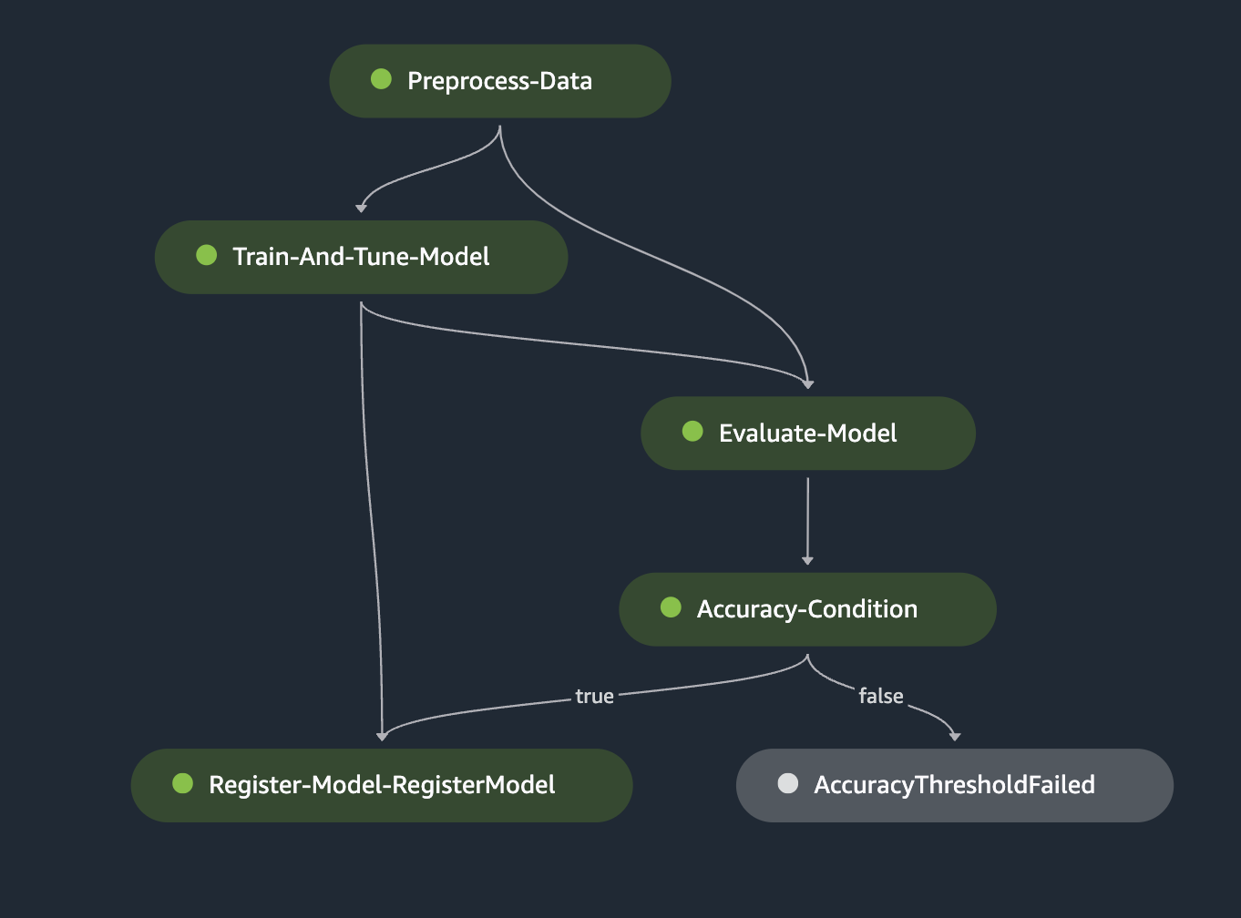 RandomForestClassifierfrom scikit-learn to train the ML model. The HyperparameterTuner class is used for running automatic model tuning, which finds the best version of the model by running many training jobs on the dataset using the algorithm and the ranges of hyperparameters. - The model evaluation step checks that the trained and tuned model has an accuracy level above a user-defined threshold and only then register that model within the model registry. If the model accuracy doesn’t meet the threshold, the pipeline fails and the model is not registered with the model registry.
