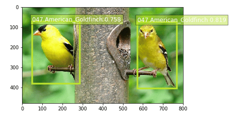 After the model endpoint is in service, we can pass in images that the model has not yet seen and see how well the birds are detected. See the sample notebook for a visualize_detections function. Given a URL to a bird image, here is the Python code to invoke the endpoint, get back a set of predicted bird species and their bounding boxes, and visualize the results:
