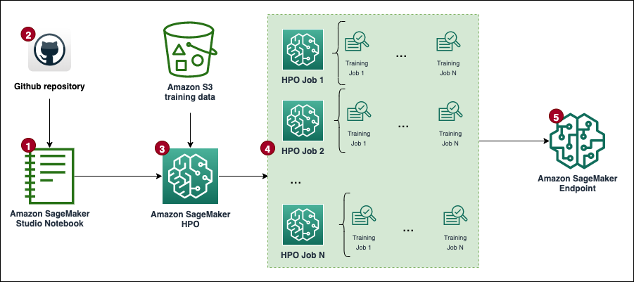 - Each HPO job will complete a set of training job trials and indicate the model with optimal hyperparameters.