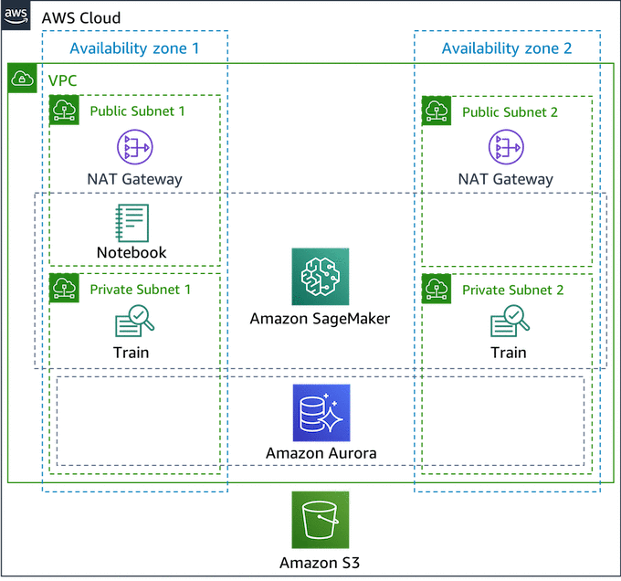 You can launch a notebook instance of Amazon SageMaker to use an environment for Jupyter to develop models in the same VPC. Because you need to connect to this instance from the open internet, at the time of development, place this instance in a public subnet. To allow connection to the Aurora database, you need to configure the virtual firewall of the instance, the security group, and the route table to define the network traffic route appropriately. You also launch a container for training a task in the VPC and create a NAT Gateway to connect to the open internet to install libraries to the container.