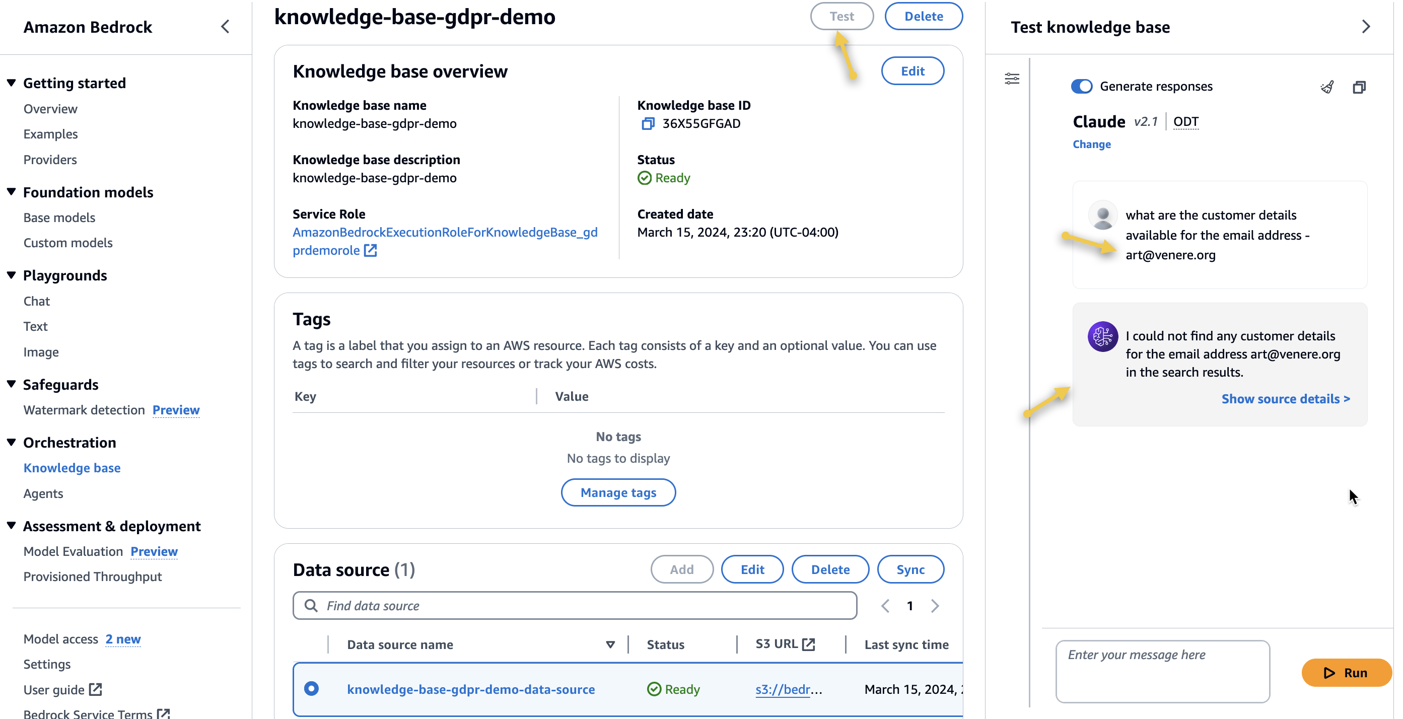 In the sample prompt, we were able to retrieve the customer’s PII information—which was stored as part of the source dataset—using the email address. To respond to GDPR right to be forgotten requests, the next sequence of steps demonstrates how customer data deletion at source deletes the information from the generative AI application powered by Amazon Bedrock Knowledge Bases.