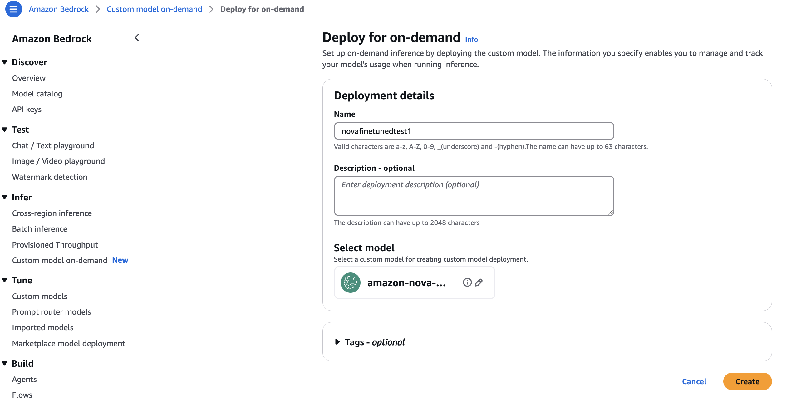 After you’ve successfully customized your Amazon Nova model, you can proceed with deploying it using the on-demand deployment option as detailed in the following sections.