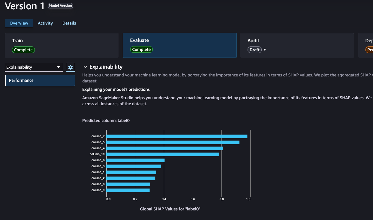 Evaluation details like model quality, bias pre-training, bias post-training, and explainability can be reviewed on the Evaluate tab.
