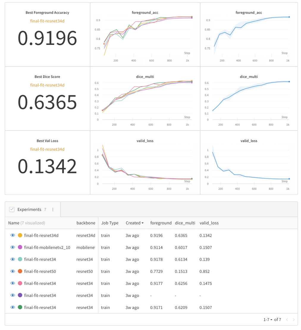 For the baseline experiments, we decided to use a simple architecture inspired by the UNet paper with different backbones from timm. We trained our models with Focal Loss as criterion. With Weights & Biases, you can easily create dashboards with summaries of your experiments to quickly analyze training results, as shown in the following screenshot. You can also view this dashboard interactively.