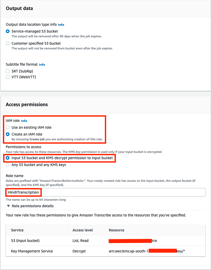 - Create a new AWS Identity and Access Management (IAM) role named HindiTranscription that provides Amazon Transcribe service permissions to read the audio files from the S3 bucket and use the AWS Key Management Service (AWS KMS) key to decrypt.