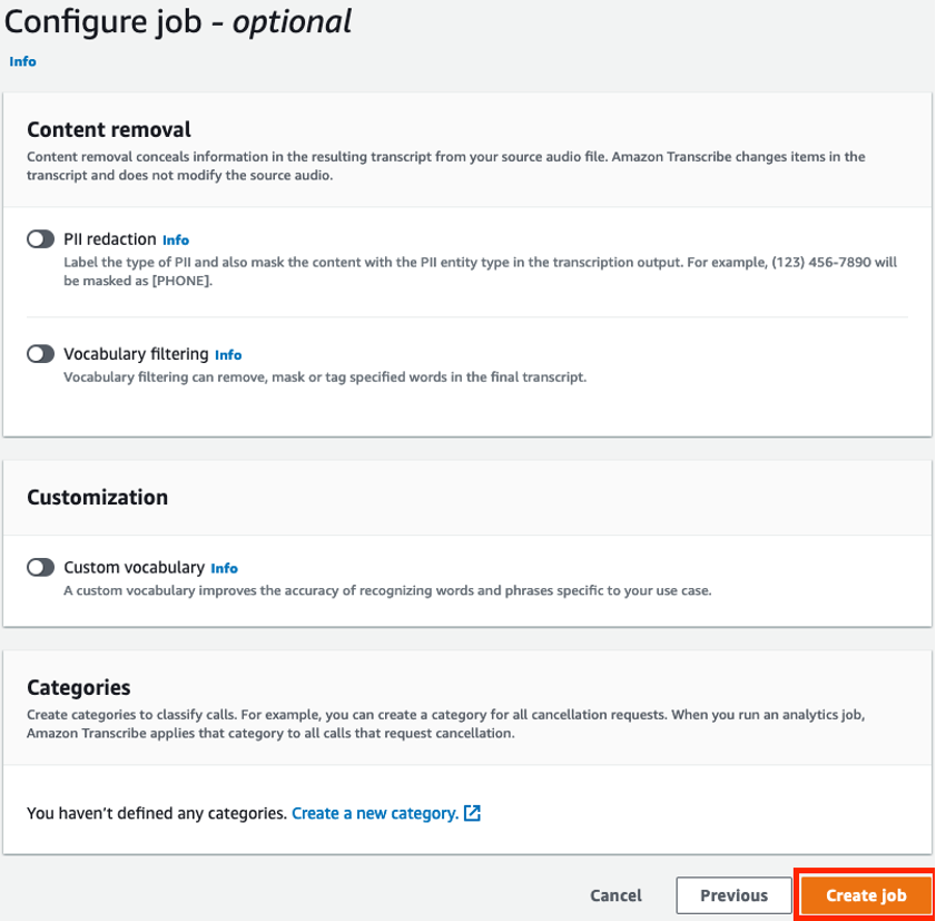 - In the Configure job section, leave the defaults, including Custom vocabulary deselected.
