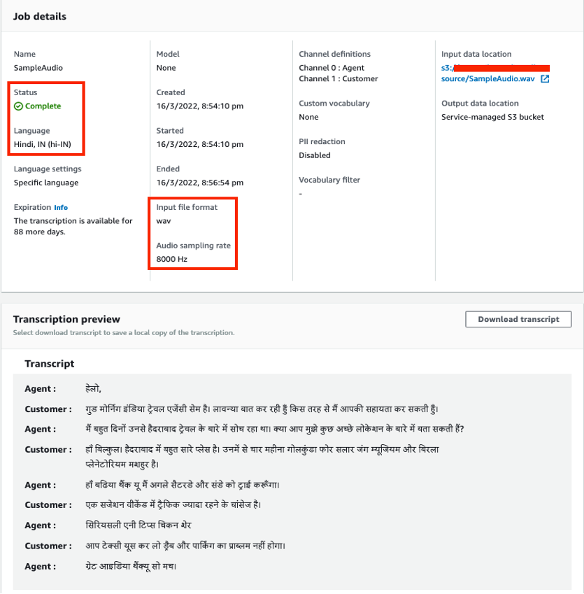 When the status of the job is Complete, you can review the transcription by choosing the job (SampleAudio).