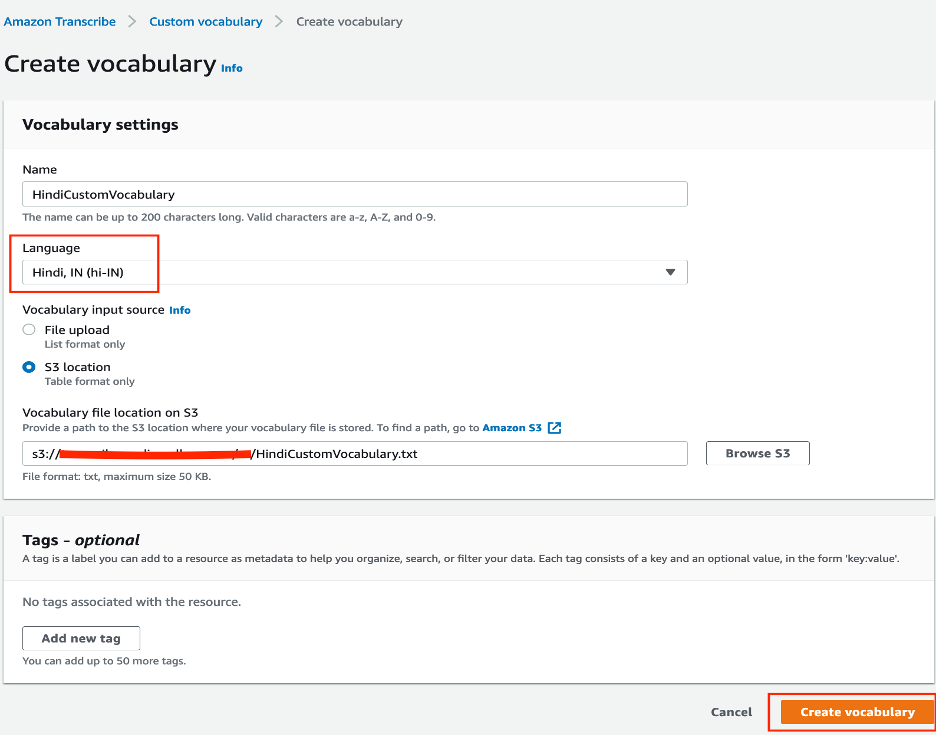 SampleAudioCustomVocabulary. - For Language, choose Hindi, IN (hi-IN).
