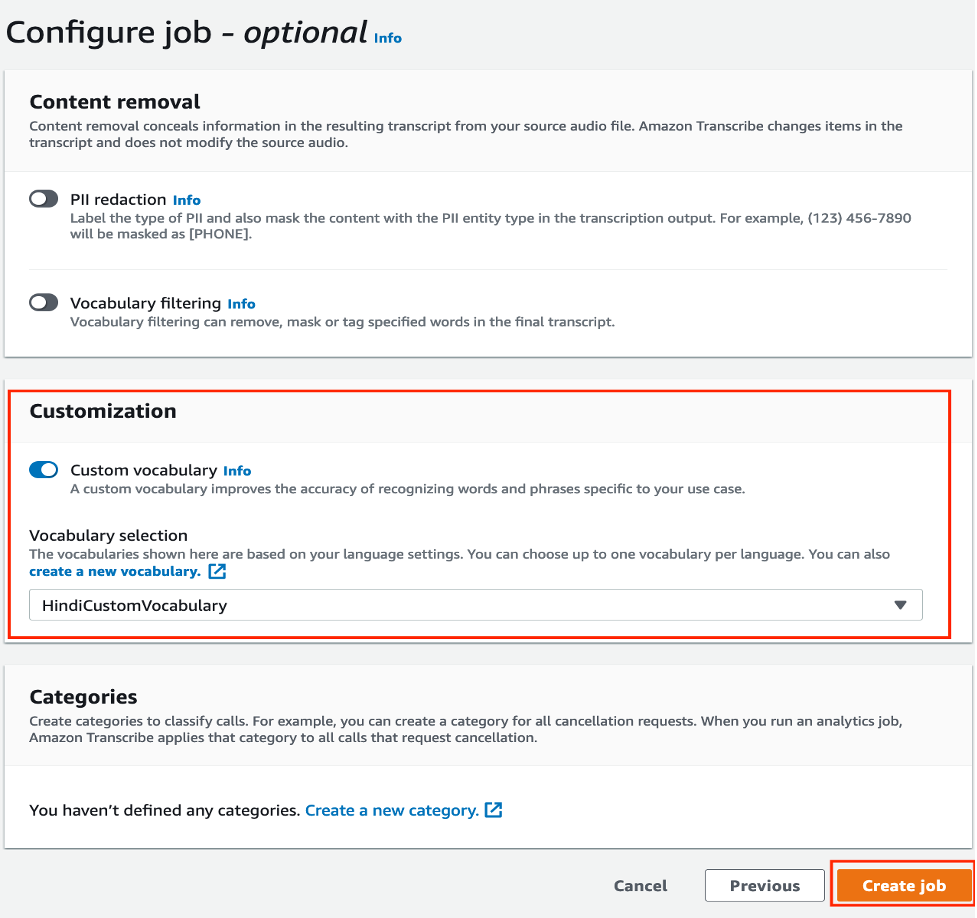 - In the Configure job section, select Custom vocabulary and choose the custom vocabulary