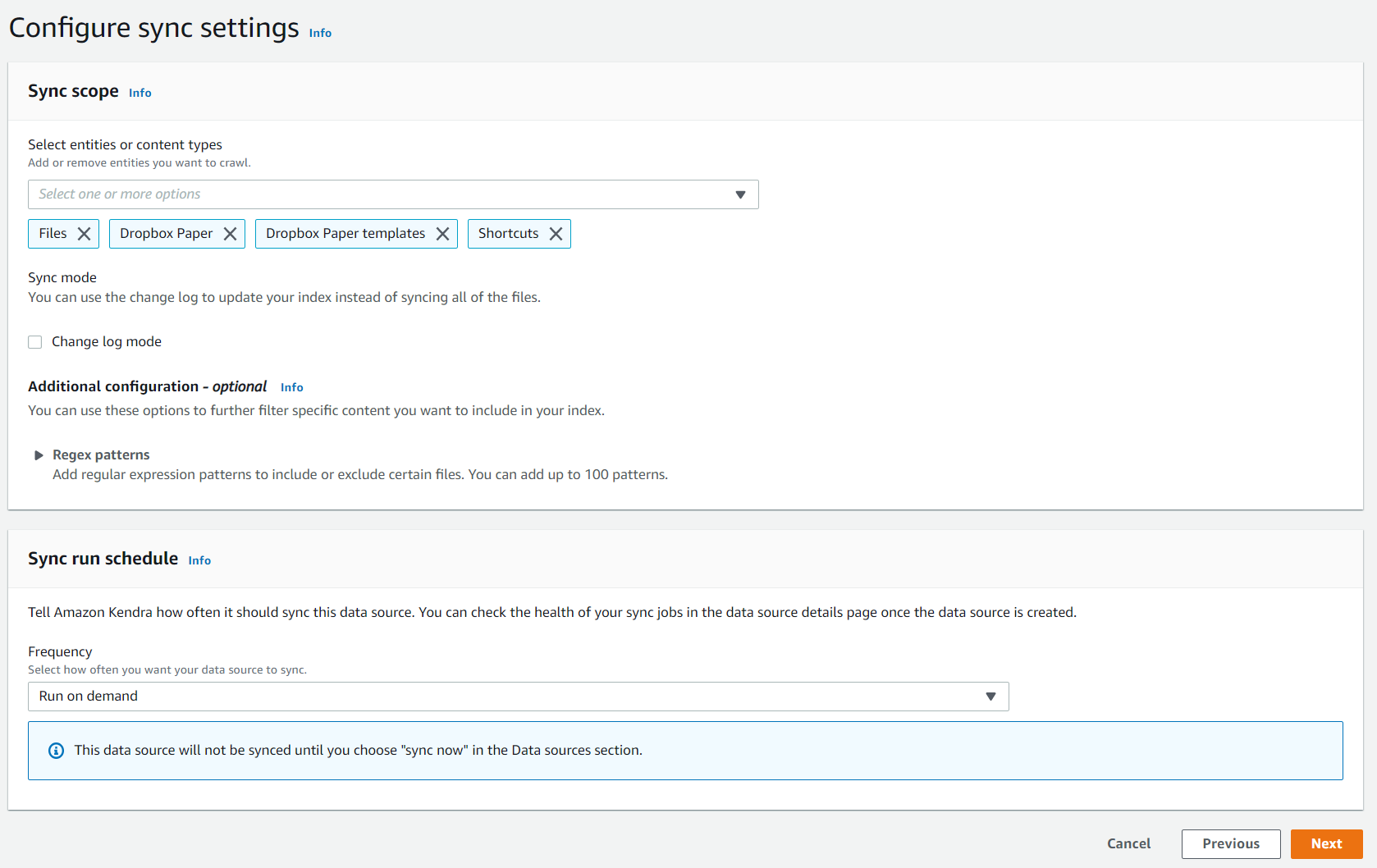 - You can integrate the Dropbox data source with the Custom Document Enrichment (CDE) capability in Amazon Kendra to perform additional attribute mapping logic and even custom content transformation during ingestion
