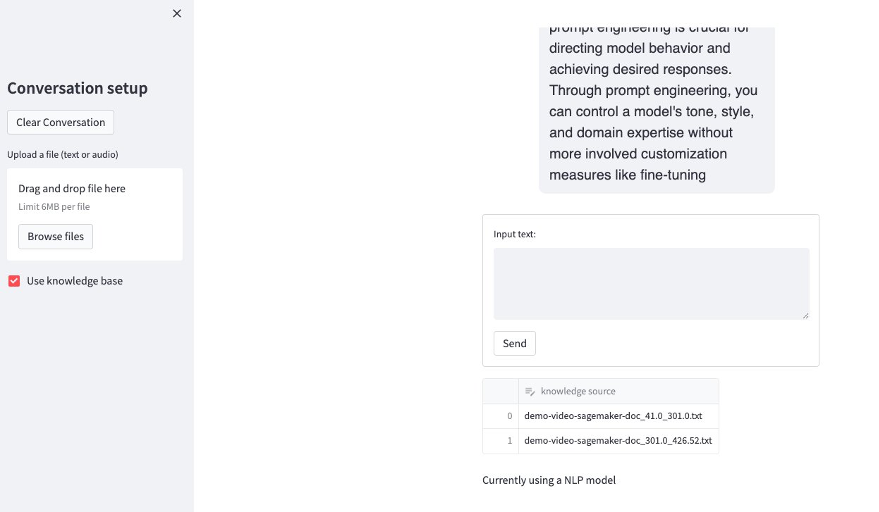 When a user uploads a text file to the chatbot, the chatbot puts the content into the LangChain memory component and the user can chat with the uploaded document. This part is inspired by the following GitHub example that builds a document chatbot with SageMaker. We also add an option to allow users to upload audio files. Then the chatbot automatically invokes the speech-to-text model hosted on the SageMaker endpoint to extract the text content from the uploaded audio file and add the text content to the LangChain memory. Lastly, we allow the user to select the option to use the knowledge base when answering questions. This is the RAG capability shown in the preceding diagram. We have defined the SageMaker endpoints that are deployed in the notebooks provided in the previous sections. Note that you need to pass the actual endpoint names that are shown in your account when running the Streamlit app. You can find the endpoint names on the SageMaker console under Inference and Endpoints.