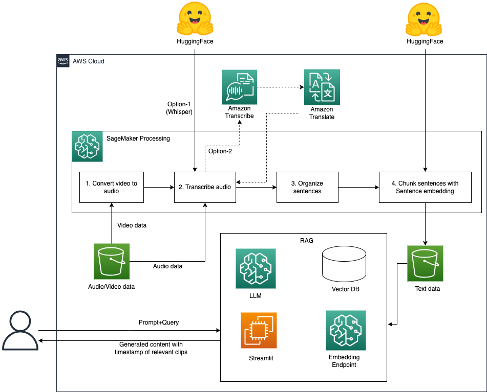 - Whisper – In real-world use cases, video data may include multiple languages, such as foreign language learning videos. Whisper is a multitasking speech recognition model that can perform multilingual speech recognition, speech translation, and language identification. You can use a Whisper model to detect and transcribe different languages on video data, and then translate all the different languages into one language. It’s important for most RAG solutions to run on the knowledge base with the same language. Even though OpenAI provides the Whisper API, for this post, we use the Whisper model from Hugging Face.
