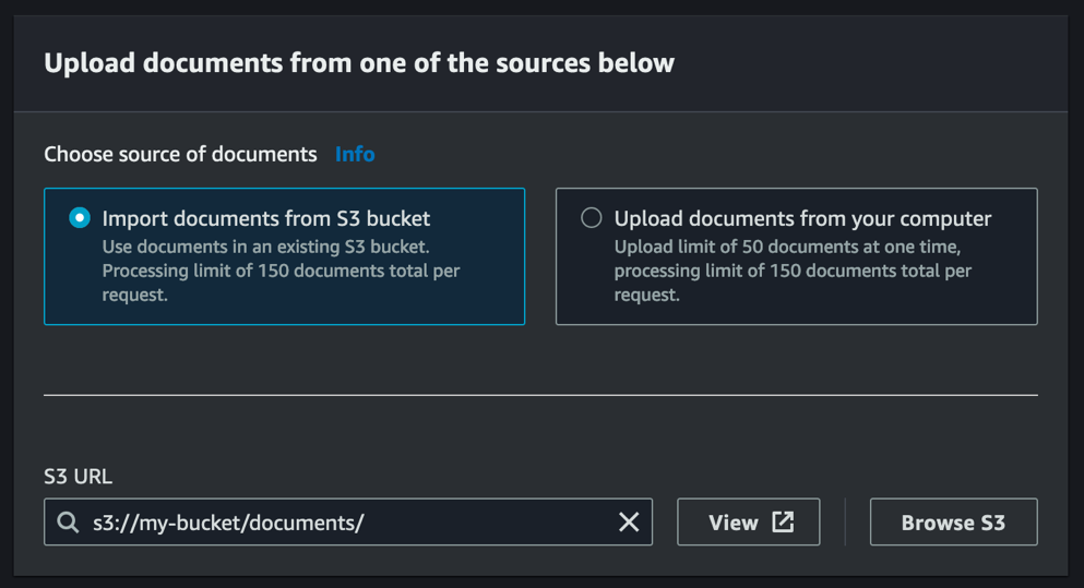 - Import documents from S3 bucket – If you’re using an S3 bucket for your documents, provide the bucket URL and (optionally) the prefix where your documents reside, in