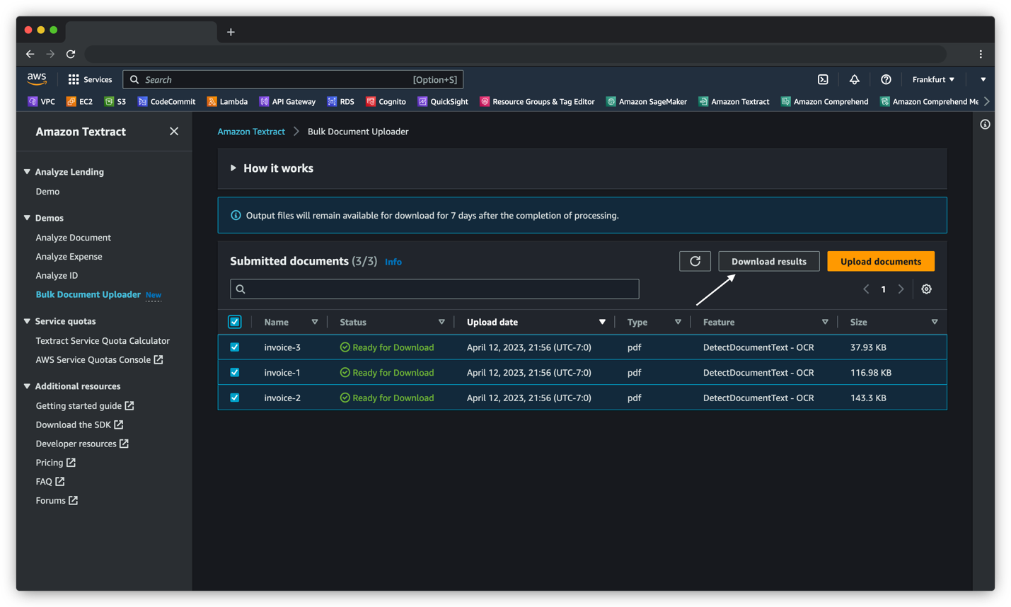 The Bulk Document Uploader provides results that you can download later for offline review. Each downloadable ZIP file contains the Amazon Textract API response in JSON file format and a human-readable CSV file of the output containing the extracted data and confidence scores. The output results are available for download for 7 days after processing. After 14 days, documents are cleared from the Submitted documents section. To use the Bulk Document Uploader, complete the following steps: