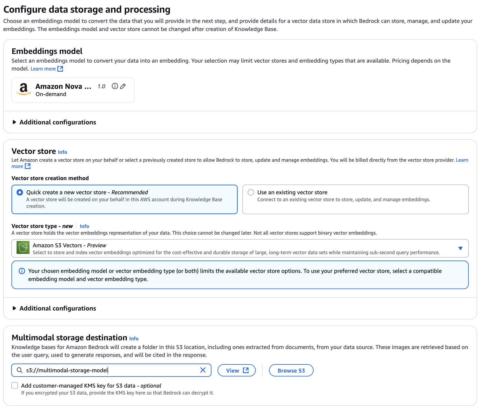 Select Amazon Nova Multimodal Embeddings as your embedding model. This unified embedding model encodes both your product images and customer queries into the same vector space, enabling cross-modal retrieval where text queries can retrieve images and image queries can find visually similar products. For this example, we use Amazon S3 Vectors as the vector store (you could optionally use other available vector stores), which provides cost-effective and durable storage optimized for large-scale vector data sets while maintaining sub-second query performance. You also need to configure the multimodal storage destination by specifying an S3 location. Knowledge Bases uses this location to store extracted images and other media from your data source. When users query the knowledge base, relevant media is retrieved from this storage.