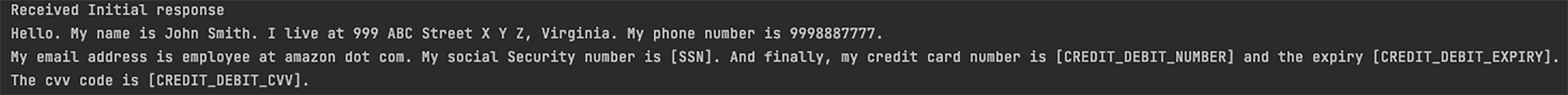 Now, click “Start streaming”. For the input voice, I said the following lines, which contains PII data, into my computer’s mic (Please note we will be using the same lines later in this blog when we test this feature programmatically):