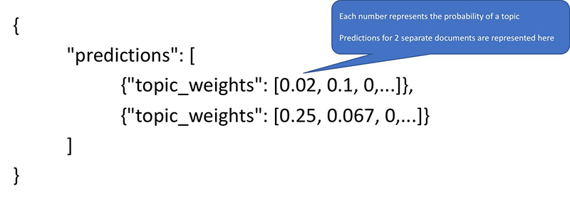 The output of the SageMaker NTM model inference looks like the following. (There is a separate prediction output line for each document in the input data. The decimal numbers represent the weights for each of the topics assigned to the document.)
