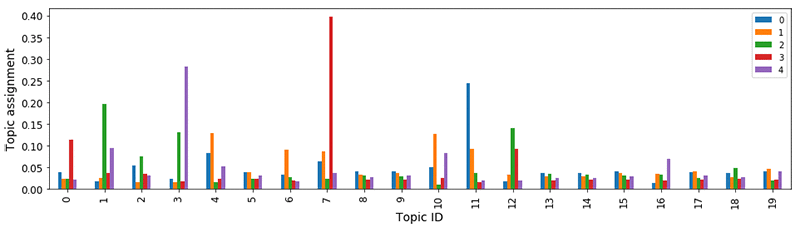 A more intuitive way to see the prediction results is to visualize topic assignments for the 5 sample testing data. Run the following code in a new cell to plot a bar chart for the topic assignment for the 20 topics.
