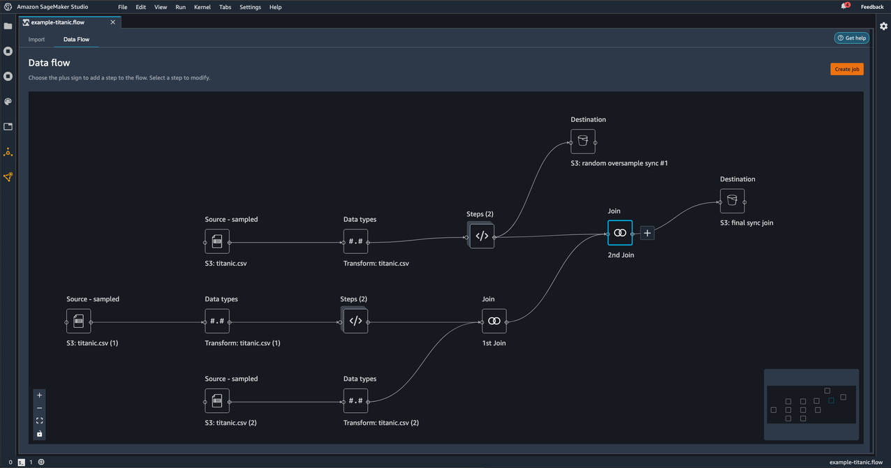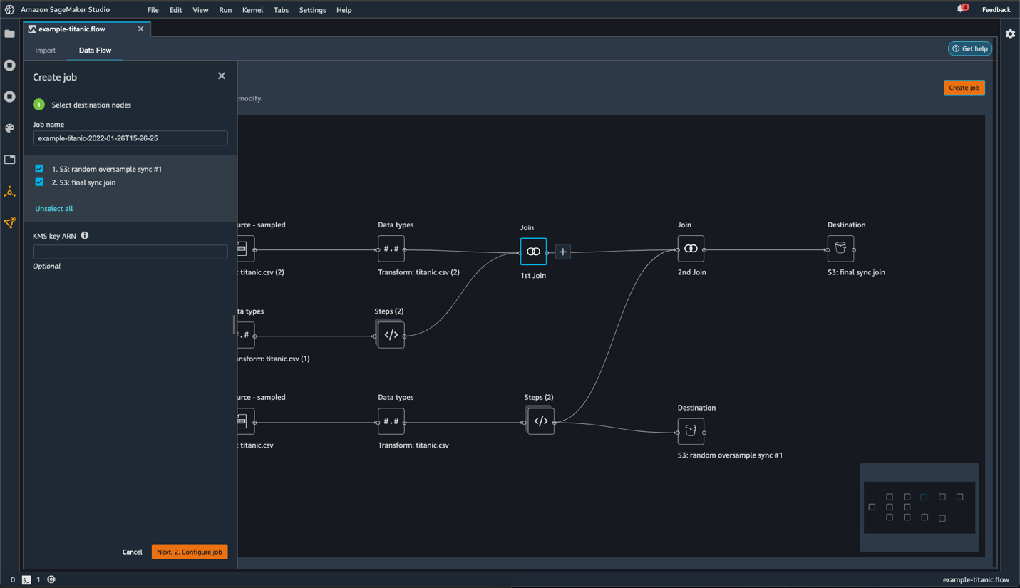 We’re excited to announce the general release of destination nodes and the Create Job feature in Data Wrangler. This feature gives you the ability to export all the transformations that you made to a dataset to a destination node with just a few clicks. This allows you to create data processing jobs and export to Amazon S3 purely via the visual interface without having to generate, run, or manage Jupyter notebooks, thereby enhancing the low-code experience. To demonstrate this new feature, we use the Titanic dataset and show how to export your transformations to a destination node.