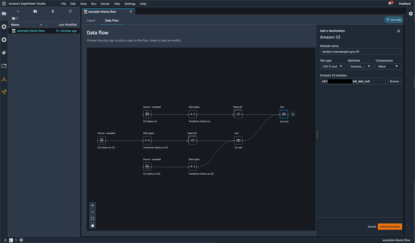 In the following steps, we demonstrate how to create destination nodes, export them to Amazon S3, and create and launch a processing job.