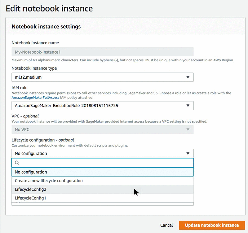 Amazon SageMaker now allows customers to update or disassociate lifecycle configurations for notebook instances with the renewed APIs. You can associate, switch between, or disable lifecycle configurations as necessary by stopping your notebook instance and using the UpdateNotebookInstance API at any point of the notebook instance’s lifespan.
