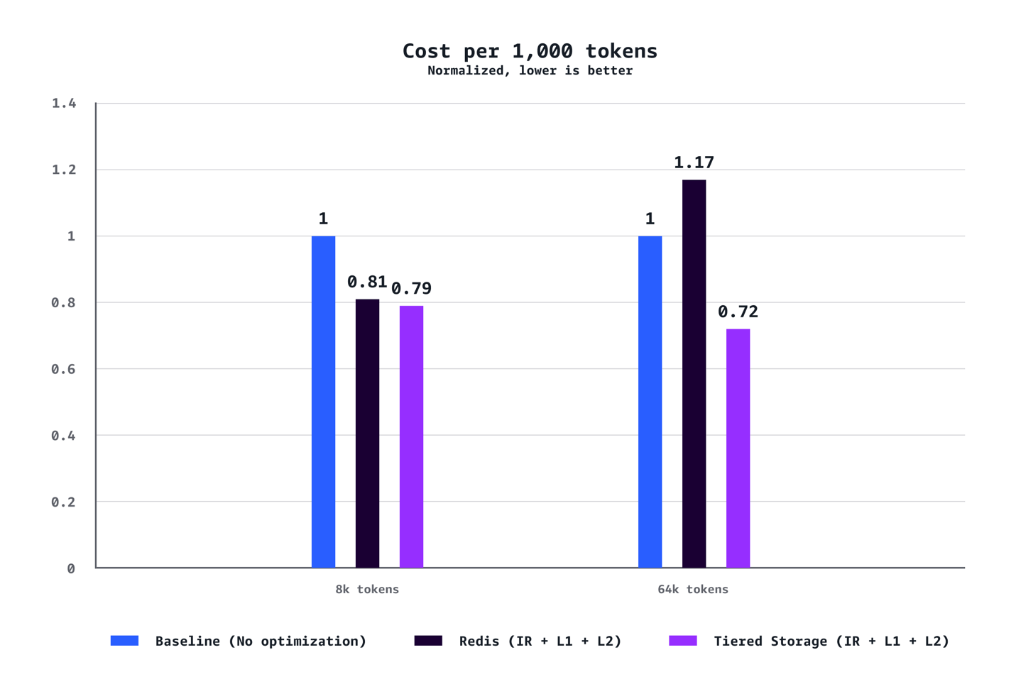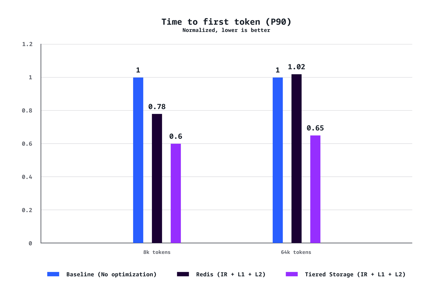 Our benchmarks demonstrate that a combination of L1 and L2 Managed Tiered KV Cache and Intelligent Routing delivers substantial performance improvements across multiple dimensions. For medium context scenarios (8k tokens), we observed a 40% reduction in time to first token (TTFT) at P90, 72% reduction at P50, 24% increase in throughput, and 21% cost reduction compared to baseline configurations without optimization. The benefits are even more pronounced for long context workloads (64K tokens), achieving a 35% reduction in TTFT at P90, 94% reduction at P50, 38% throughput increase, and 28% cost savings. The optimization benefits scale dramatically with context length. While 8K token scenarios demonstrate solid improvements across the metrics, 64K token workloads experience transformative gains that fundamentally change the user experience. Our testing also confirmed that AWS-managed tiered storage consistently outperformed Redis-based L2 caching across the scenarios. The tiered storage backend delivered better latency and throughput without requiring the operational overhead of managing separate Redis infrastructure, making it the recommended choice for most deployments. Finally, unlike traditional performance optimizations that require tradeoffs between cost and speed, this solution delivers both simultaneously.