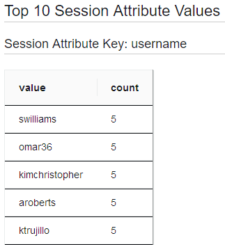 The dashboard shows tables that aggregate the top slots and session attributes values. The session attributes and slots are dynamically extracted from the conversation logs. These widgets can be configured to exclude specific session attributes and slots by modifying the parameters of the widget. These tables are useful to identify the top values provided to the bot in slots (data inputs) and to track the top custom application information kept in session attributes.