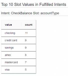 You can track conversations with a widget listing the top messages (utterances) sent to your bot and a table containing a history of messages. You can expand each message in the Message History section to look at conversation state details when the message was sent.