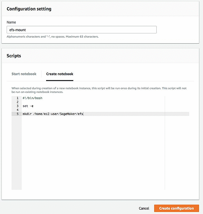 However, when we first start our notebook instance, there won’t be an efs directory on it to mount to. So, let’s write our Create notebook script to set this up. Then choose Create configuration.