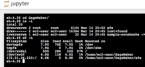 Currently Amazon SageMaker notebook instances start with 5 GB of Amazon Elastic Block Store (EBS) storage, and about 20 GB of non-persistent storage. Larger files can be accessed from Amazon S3, but this doesn’t offer the same flexibility as a file system. Use cases that require this flexibility and large datasets are met by mounting EFS to a notebook instance. Some customers are also likely to have existing EFS mounts where files are stored and shared across existing EC2 instances. This is another area where EFS and Amazon SageMaker work together well.