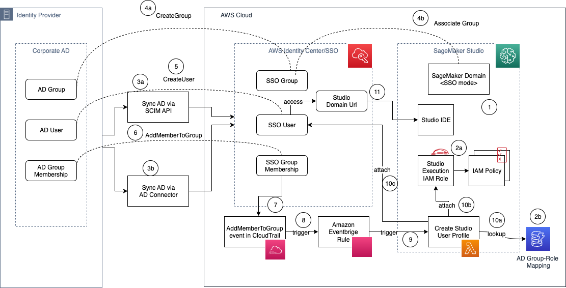 In this post, we provide prescriptive guidance for the solution to provision SSO users to Studio with least privilege permissions based on AD group membership. This guidance enables you to quickly scale for onboarding hundreds of users to Studio and achieve your security and compliance posture.